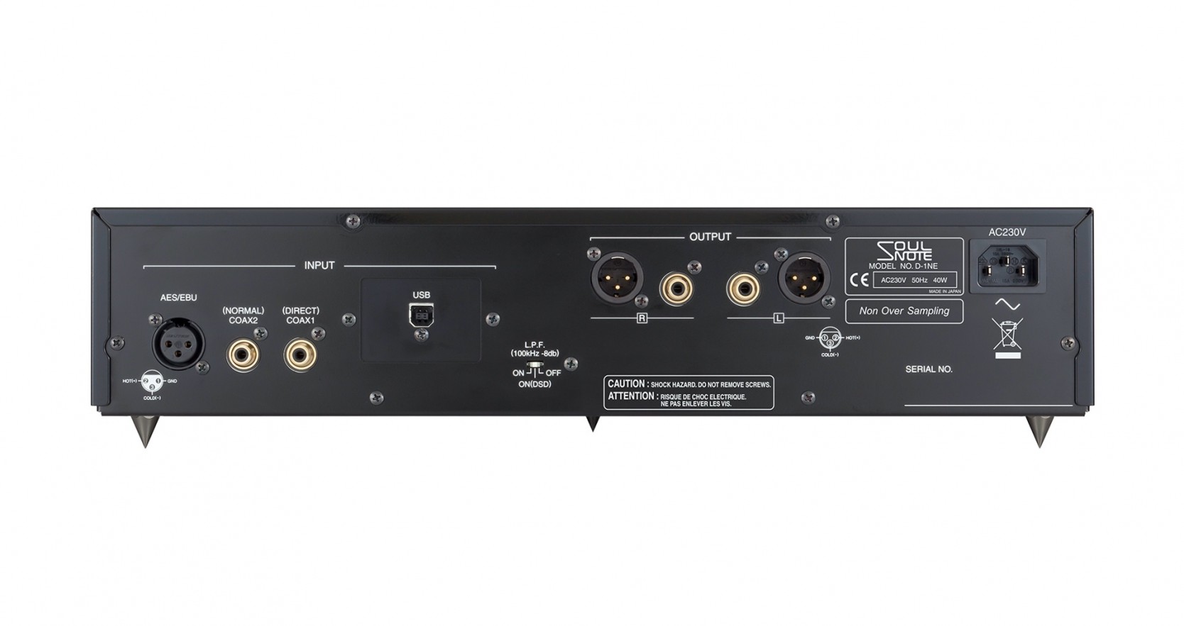 Oryginalny dyskretny wzmacniacz SOULNOTE bez NFB, który rozciąga się w zakresie MHz, odbiera do 120 mA z ES9038PRO i wzmacnia tę moc na wyjściu. Podstawą jest doskonale zbalansowany, dyskretny obwód bez NFB, używany również w Phono Equalizer E-1. Napięcie, prąd i temperatura tranzystora w każdym stopniu zostały „dokładnie zbadane podczas słuchania dźwięku”. W rezultacie ES9038PRO został dalej rozwinięty jako dedykowany wzmacniacz. Połączenie ES9038PRO i dyskretnego wzmacniacza bez NFB pozwala uzyskać żywe odtwarzanie muzyki, pełne energii, której nie można uzyskać ze standardowych obwodów wzmacniacza OP. Całkowicie eliminując duże obciążenie i zniekształcenia TIM, które mogą stanowić problem przy normalnym wzmocnieniu sprzężenia zwrotnego IV, D-1N zapewnia energiczne i uduchowione odtwarzanie muzyki.
