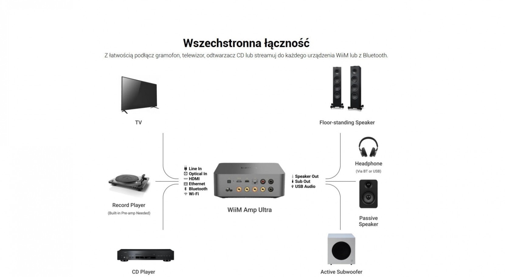 Sterowanie głosowe i multiroom – Synchronizuje się z głośnikami WiiM, Alexa lub Google; sterowanie odtwarzaniem przez aplikację, asystentów głosowych lub dołączony pilot głosowy.